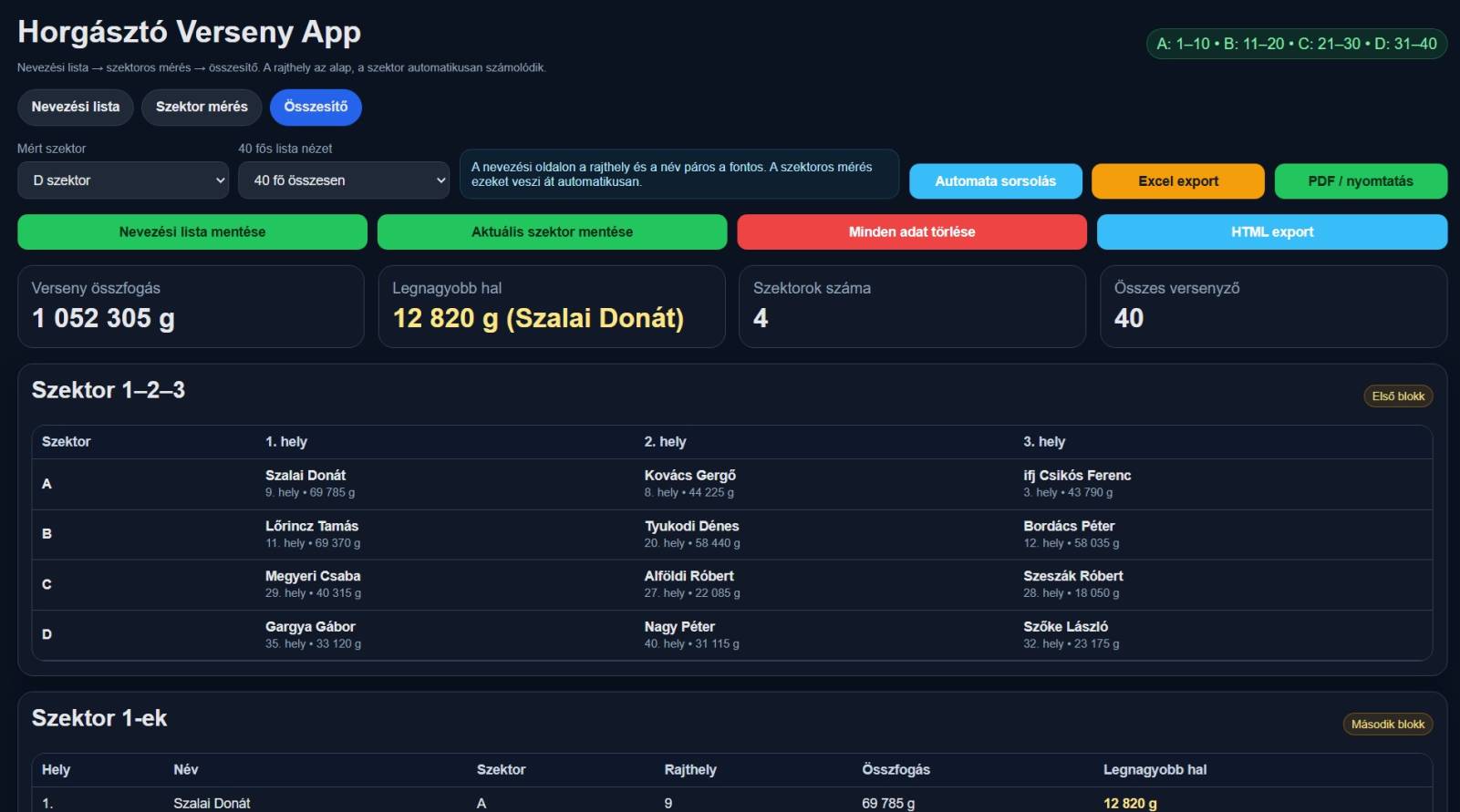 A versenyszoftver használható a nevezési lista kezelésére, a sorsolásra, a fogások rögzítésére, összesítésre, exportálásra és nyomtatásra.